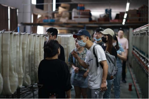 接著,大家參觀了公司的真絲倍捻車間、服裝生產(chǎn)車間。公司桑羅品牌副總陳珂給大家介紹了華佳從源頭蠶繭開始把控,在云南海拔1870米的地方建立萬(wàn)畝純天然桑蠶基地,培育出吐絲可以達(dá)到1600米長(zhǎng)度的蠶寶寶。目前,公司將精品生絲標(biāo)準(zhǔn)做到國(guó)家最高等級(jí)精6A,成為中國(guó)絲綢行業(yè)的引領(lǐng)者,也是國(guó)內(nèi)外眾多奢侈品牌用絲的專屬原料,如愛馬仕等。