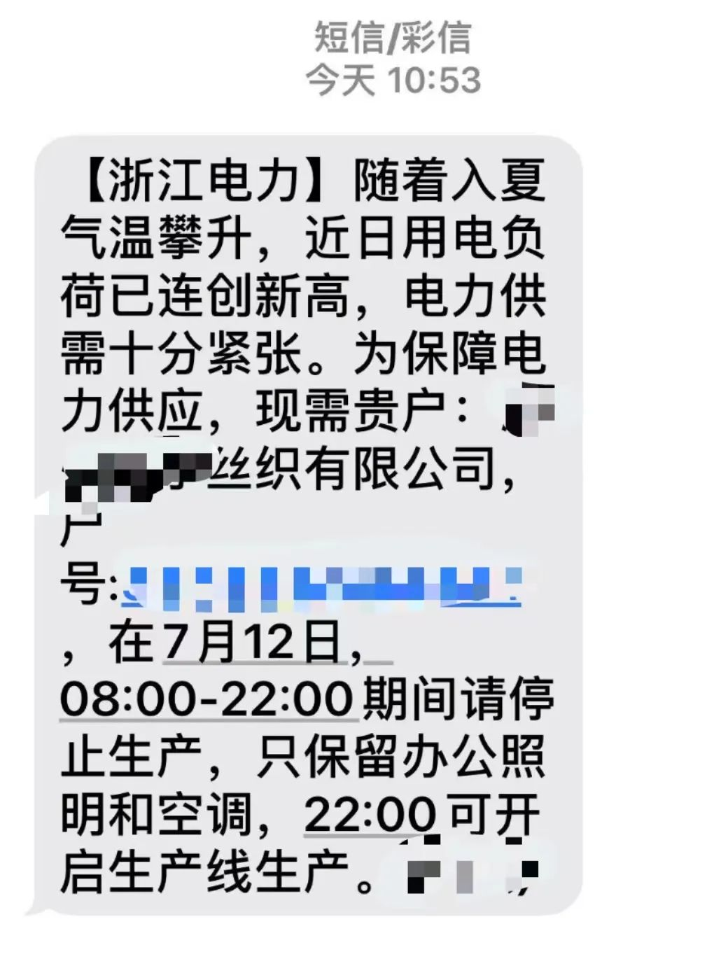 今日(7月11日),據(jù)了解,絲織集聚地的湖州市吳興的工業(yè)園區(qū)和重兆的工業(yè)園區(qū)的部分絲織企業(yè)接到限電通知。