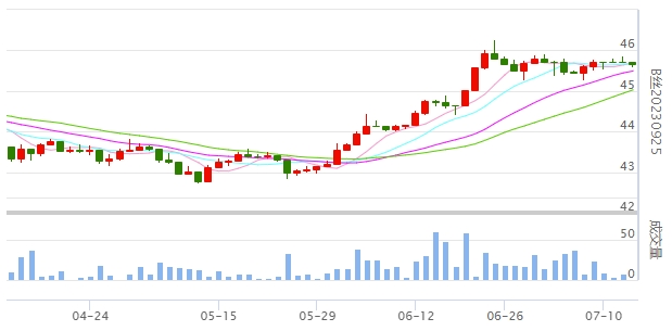 今日(2023年07月13日,周四)中國(guó)繭絲綢交易市場(chǎng)生絲指數(shù)下跌0.14%收于4591.54點(diǎn)。B絲(商檢4A級(jí)生絲):230725合約下跌0.09萬(wàn)元報(bào)收于45.45萬(wàn)元;230925合約下跌0.06萬(wàn)元報(bào)收于45.66萬(wàn)元;240325合約下跌0.06萬(wàn)元報(bào)收于46.77萬(wàn)元。