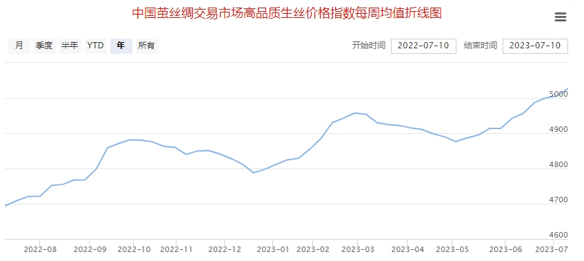 今日(2023年07月14日,周五)中國繭絲綢交易市場生絲指數(shù)上漲0.53%收于4615.73點(diǎn),本周生絲指數(shù)上漲0.50%。B絲(商檢4A級生絲):230725合約上漲0.24萬元報收于45.69萬元;230925合約上漲0.24萬元報收于45.90萬元;240325合約上漲0.45萬元報收于47.22萬元。