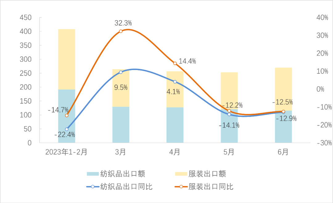 今年二季度以來,行業(yè)外貿(mào)形勢較為嚴峻,4月我國紡織品服裝出口額同比增速明顯放緩,并于5月落入負增長區(qū)間。6月當月,我國紡織品服裝對全球出口269.9億美元,同比減少12.7%(以人民幣計同比下降8.8%),降幅較上月略有收窄。其中,紡織品出口115.7億美元,同比減少12.9%(以人民幣計同比減少9%);服裝出口154.2億美元,同比下降12.5%(以人民幣計同比減少8.7%)。