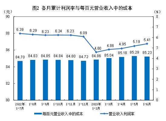 1—6月份,規(guī)模以上工業(yè)企業(yè)每百元營(yíng)業(yè)收入中的成本為85.23元,同比增加0.81元;每百元營(yíng)業(yè)收入中的費(fèi)用為8.34元,同比增加0.25元。