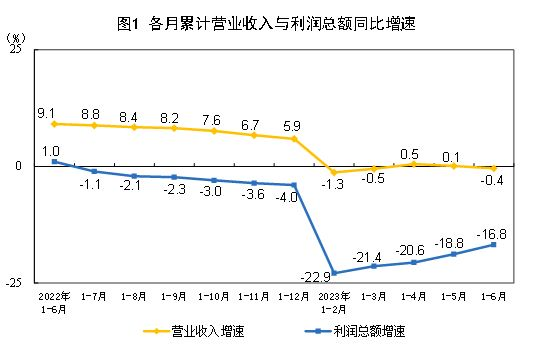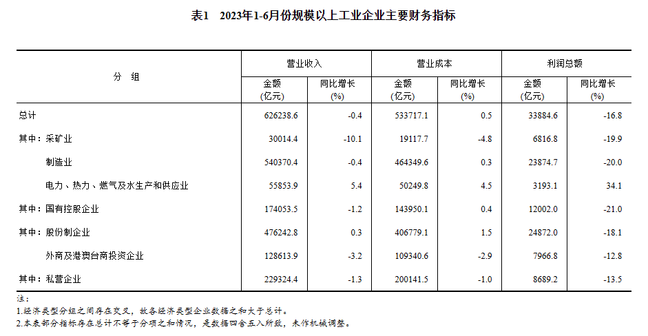 1—6月份,全國(guó)規(guī)模以上工業(yè)企業(yè)實(shí)現(xiàn)利潤(rùn)總額33884.6億元,同比下降16.8%,降幅比1—5月份收窄2.0個(gè)百分點(diǎn)(按可比口徑計(jì)算,詳見(jiàn)附注二)。