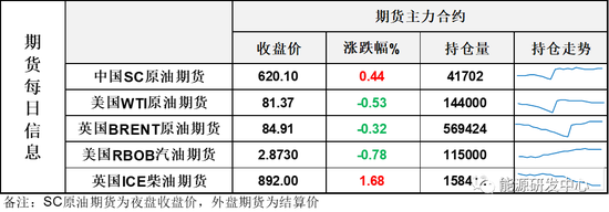 【1】WTI主力原油期貨收跌0.43美元,跌幅0.53%,報81.37美元/桶;布倫特主力原油期貨收跌0.27美元,跌幅0.32%,報84.91美元/桶;INE原油期貨收漲0.44%,報620.1元。