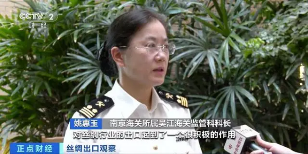 南京海關(guān)所屬吳江海關(guān)監(jiān)管科科長 姚惠玉:跨境電商的發(fā)展,對絲綢行業(yè)的出口起到積極的作用。上半年吳江轄區(qū)出口絲綢制品金額達2.34億元,同比增長56.4%。