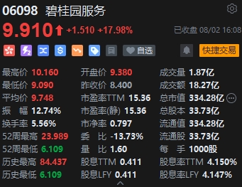 物管股逆勢(shì)上漲,碧桂園服務(wù)(9.91, 1.51, 17.98%)漲近18%領(lǐng)銜。消息面上,碧桂園服務(wù)發(fā)布盈警,上半年,估計(jì)收入約206.5億至208.5億元,較去年同期的200.55億元有所增長(zhǎng)。此外,碧桂園服務(wù)在昨晚表示計(jì)劃在公開(kāi)市場(chǎng)購(gòu)回股份,不多于3.37億股(占已發(fā)行股份總數(shù)的10%)。