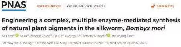 8月8日,PNAS在線發(fā)表了江蘇科技大學生物技術學院/農(nóng)業(yè)農(nóng)村部蠶桑遺傳改良重點實驗室譚安江團隊題為“Engineering a complex, multiple enzyme-mediated synthesis of natural plant pigments in the silkworm, Bombyx mori”的研究論文,該研究首次報道了在昆蟲(家蠶)中構建天然植物化合物的多基因生物合成途徑,從而高效合成一種水溶性植物色素-甜菜紅素。