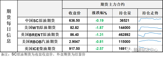 【1】WTI主力原油期貨收跌1.58美元,跌幅1.87%,報82.82美元/桶;布倫特主力原油期貨收跌1.15美元,跌幅1.31%,報86.4美元/桶;INE原油期貨收跌0.19%,報636.5元。