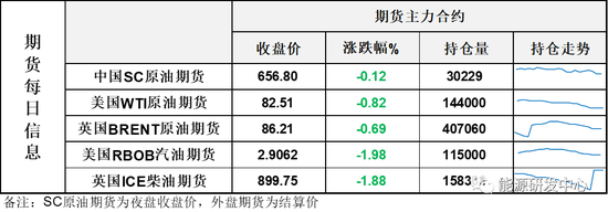 【1】WTI主力原油期貨收跌0.68美元,跌幅0.82%,報82.51美元/桶;布倫特主力原油期貨收跌0.6美元,跌幅0.69%,報86.21美元/桶;INE原油期貨收跌0.12%,報656.8元。