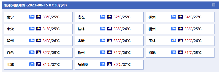 南寧市:今天白天到晚上,多云有陣雨或雷雨、局地大雨或暴雨,偏南風(fēng)1~2級,最高氣溫33℃,最低氣溫25℃。