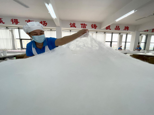 烈日辭暑,涼風(fēng)報(bào)秋。8月8日,隨著秋天第一個(gè)節(jié)氣“立秋”的到來,輕薄保暖的蠶絲被也開始進(jìn)入銷售旺季。在“中國蠶桑之鄉(xiāng)”河池市宜州區(qū),繭絲綢企業(yè)的制被車間里到處可見一派繁忙的生產(chǎn)景象。工人們4人一組,按照訂單規(guī)格忙著將銀白色的蠶絲兜拉成薄如蟬翼的絲網(wǎng),趕制蠶絲被。