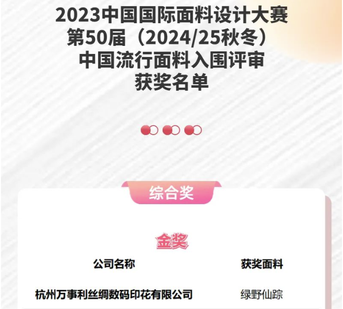 行業(yè)新聞丨萬(wàn)事利等絲綢企業(yè)在2023中國(guó)國(guó)際面料設(shè)計(jì)大賽中獲得優(yōu)異成績(jī)