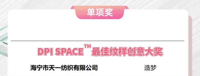 海寧市天一紡織有限公司的面料“造夢(mèng)”榮獲DPISPACETM最佳紋樣創(chuàng)意大獎(jiǎng)。