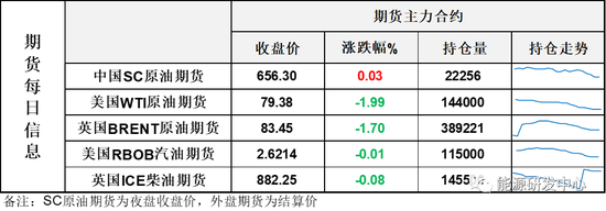 【1】WTI主力原油期貨收跌1.61美元,跌幅1.99%,報(bào)79.38美元/桶;布倫特主力原油期貨收跌1.44美元,跌幅1.7%,報(bào)83.45美元/桶;INE原油期貨收漲0.03%,報(bào)656.3元。
