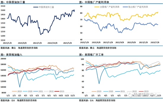 盡管國際能源署(IEA)美國將推動非歐佩克+石油產(chǎn)量增加190 萬桶/天,盡可能填補歐佩克+減產(chǎn)帶來的供應損失,但相對于全年增長的需求來看,2023年下半年原油市場仍會有明顯的去庫。最新一期的EIA報告顯示08月11日當周除卻戰(zhàn)略儲備的商業(yè)原油庫存減少596.0萬桶至4.4億桶,降幅1.34%。俄克拉荷馬州庫欣原油庫存 -83.7萬桶,前值15.9萬桶。當周美國戰(zhàn)略石油儲備(SPR)庫存增加60.0萬桶至3.484億桶,增幅0.17%。美國至8月11日當周EIA精煉油庫存 29.6萬桶,預期-47.3萬桶,前值-170.6萬桶。汽油庫存 -26.1萬桶,預期-126萬桶,前值-266.1萬桶。取暖油庫存 -10.1萬桶,前值16.6萬桶。從EIA數(shù)據(jù)來看全口徑庫存維持了持續(xù)去庫表現(xiàn),原油及汽柴油庫存壓力均較小。需求端中美市場保持強勢,美國煉油廠運行水平達到自2020年1月以來最高水平,而中國原油加工量更是繼續(xù)刷新了3年來的高點,這樣的表現(xiàn)也為油價延續(xù)強勢提供了條件。