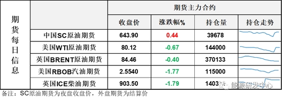 【1】WTI主力原油期貨收跌0.54美元,跌幅0.67%,報80.12美元/桶;布倫特主力原油期貨收跌0.34美元,跌幅0.4%,報84.46美元/桶;INE原油期貨收漲0.44%,報643.9元。