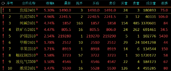 午盤收盤,國內(nèi)期貨主力合約漲多跌少。焦煤(1512, 51.00, 3.49%)漲超5%,焦炭(2251, 51.00, 2.32%)、純堿、鐵礦(811, 22.50, 2.86%)石漲超4%,滬錫(218930, 990.00, 0.45%)漲超2%,甲醇(2509, 1.00, 0.04%)、蘋果(8903, -4.00, -0.04%)、螺紋鋼(3722, 36.00, 0.98%)漲近2%;跌幅方面,菜粕跌超3%,集運指數(shù)(歐線)、豆粕(3983, -54.00, -1.34%)跌超2%,低硫燃料油(LU)跌近2%。