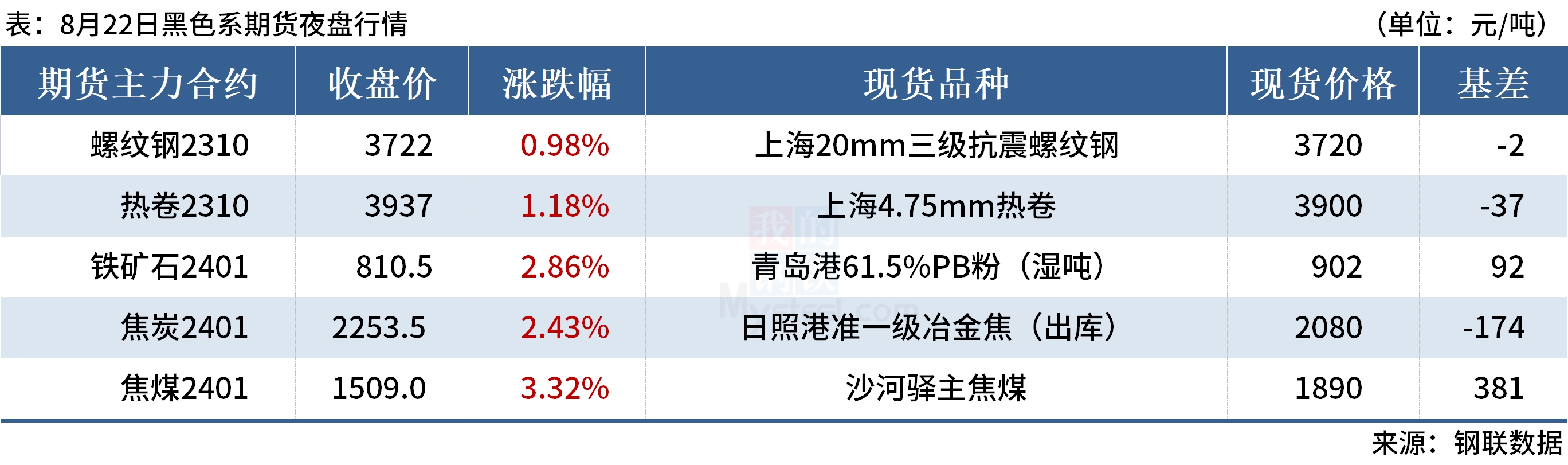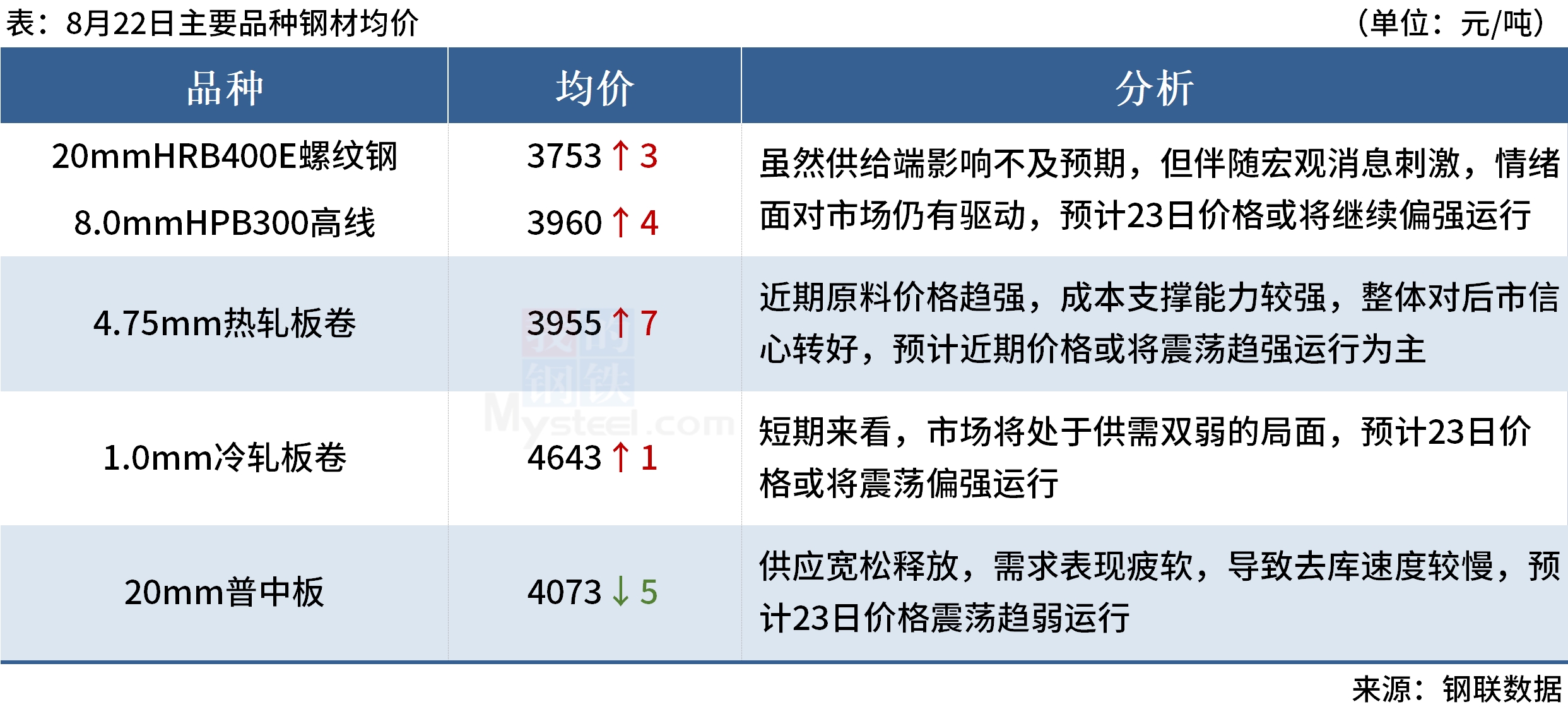 ◎8月22日,山東、河北主流鋼廠對(duì)焦炭(2250, 50.00, 2.27%)采購(gòu)價(jià)下調(diào),濕熄降幅100元/噸,干熄降幅110元/噸,目前仍有個(gè)別焦企暫未接受。
