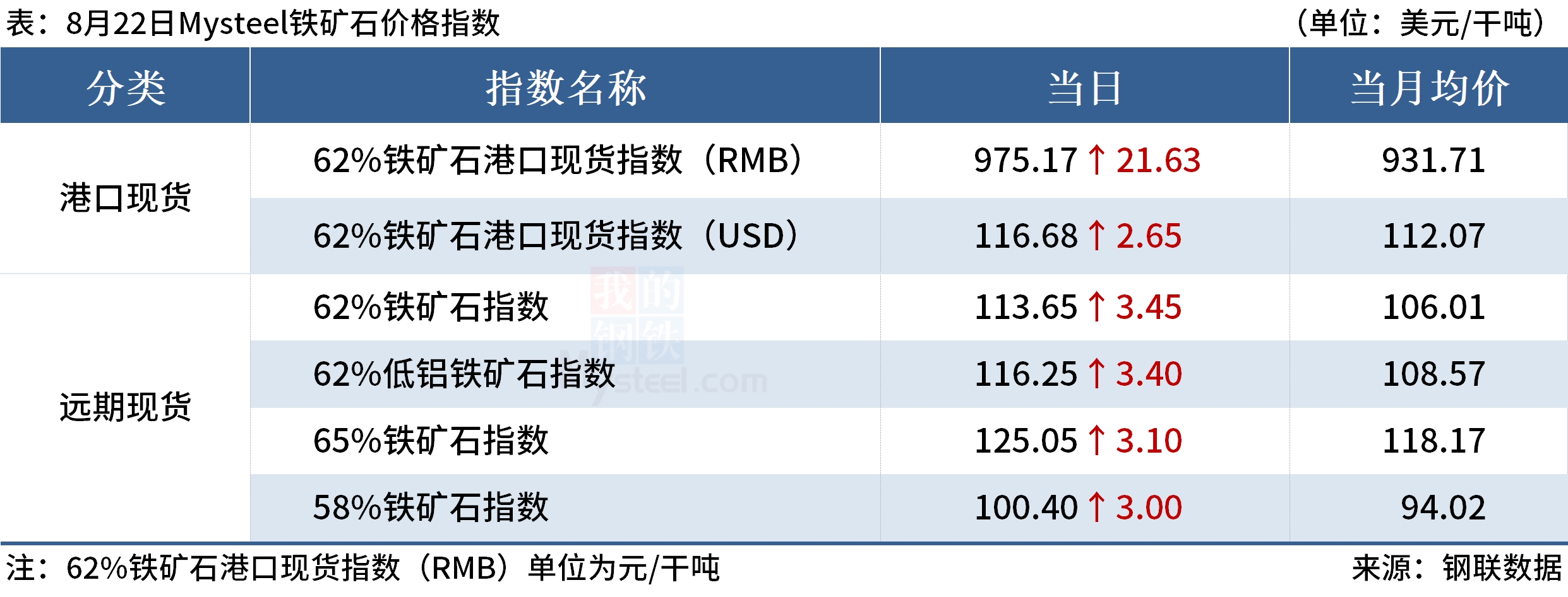 ◎8月22日,全國(guó)主港鐵礦(811, 23.00, 2.92%)石成交137.00萬(wàn)噸,環(huán)比增28.2%;237家主流貿(mào)易商建筑鋼材成交17.33萬(wàn)噸,環(huán)比增15.5%。