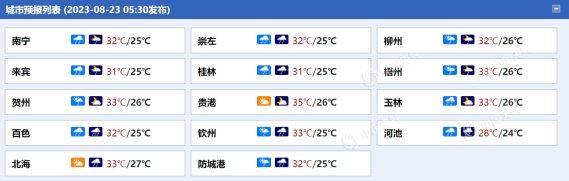今明兩天(8月23日至24日),廣西北部、西部等地降雨持續(xù),局地有暴雨到大暴雨,并伴有強對流天氣,需注意防范局地強降雨可能引發(fā)的城市內澇、山洪、泥石流、滑坡等次生災害。后天,廣西降雨將明顯減弱。